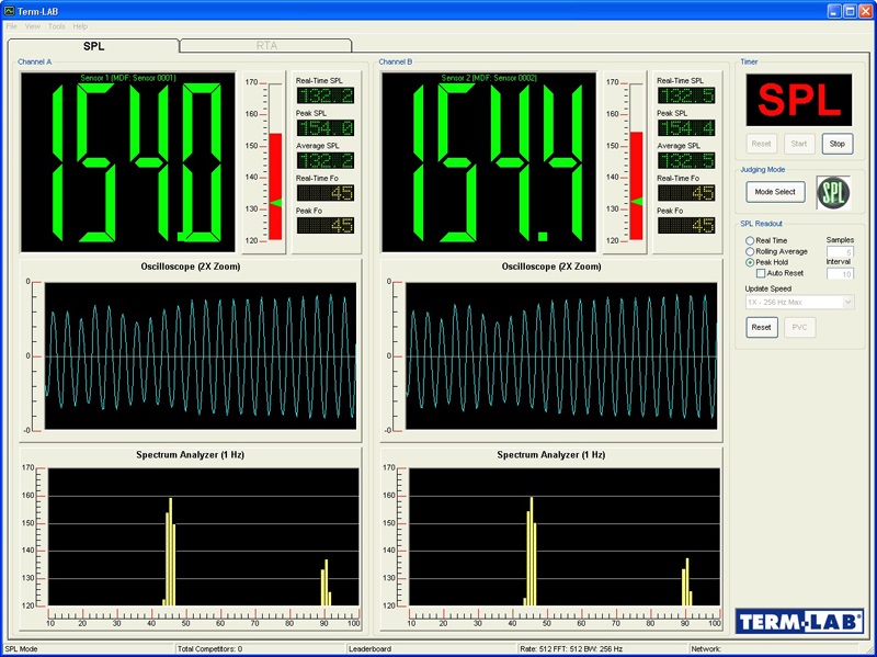 NEW! - Digital Displays show the current SPL, Peak SPL, Average SPL, Current Frequency where the current Peak SPL occurred and the Frequency where the maximum peak-hold SPL occured. This is an incredible tool for maximizing your SPL score or tuning your vehicle!
